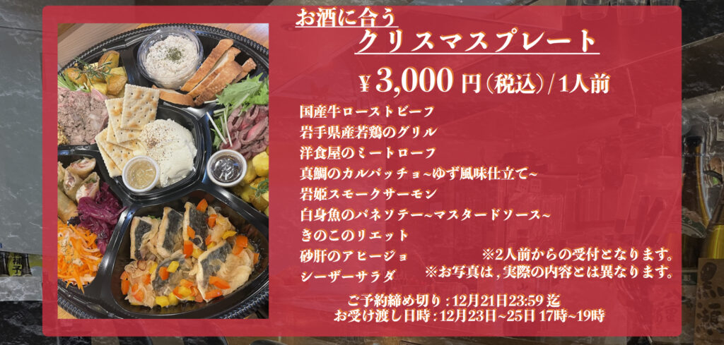 厳選した食材たちで、お酒に良く合うクリスマスプレートを仕立てさせて頂きます。